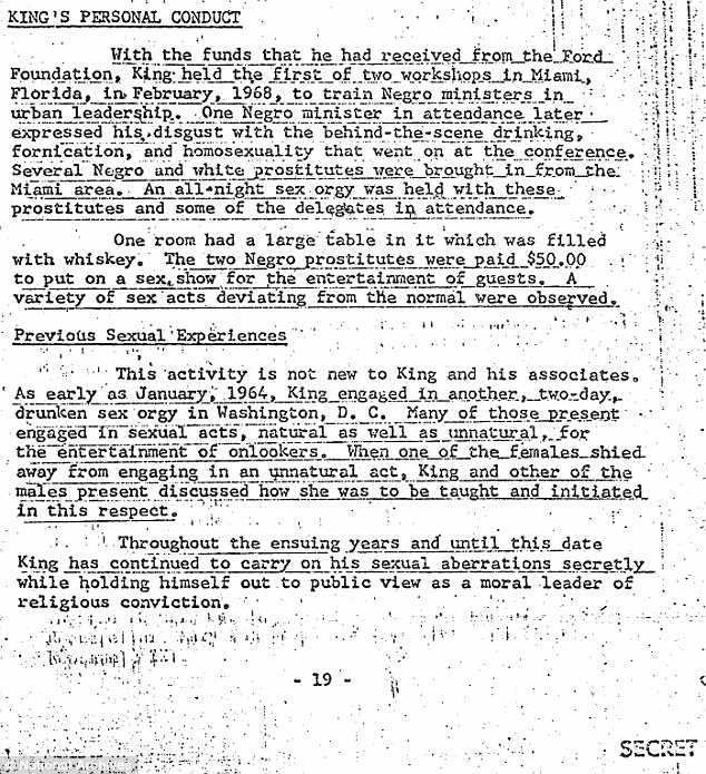The document describes the alleged sex acts King engaged in as “unnatural” and “abnormal,” and details an orgy that took place during workshops King held in Miami, Florida, in February 1968 with funds from the Ford Foundation to train black ministers in leadership.