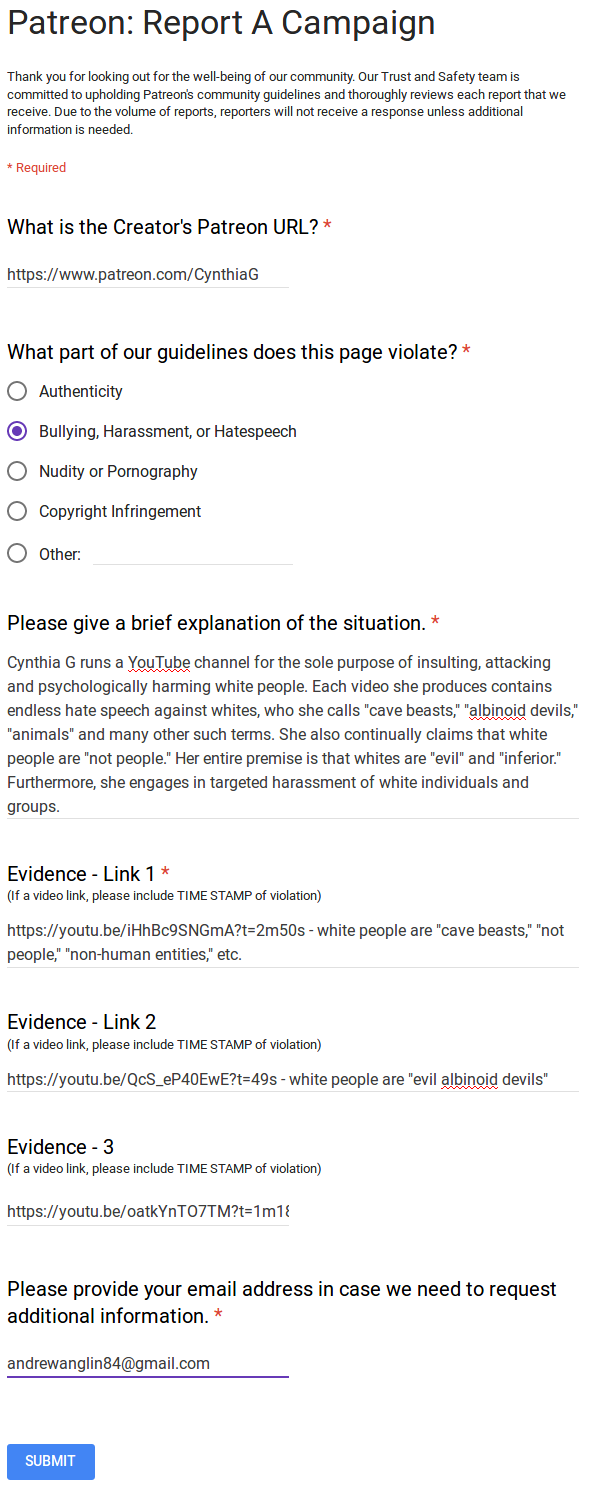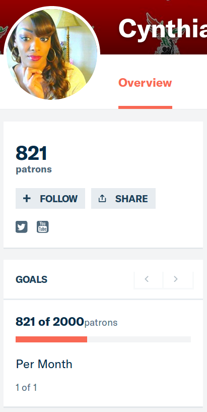 I was recently watching a funny video from 4chan fav Cynthia G, a black supremacist YouTuber, and noticed that she is using Patreon to fund her hate videos.