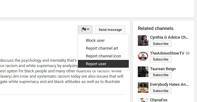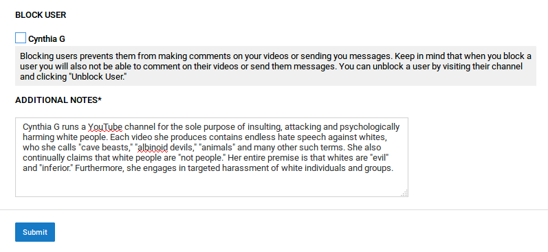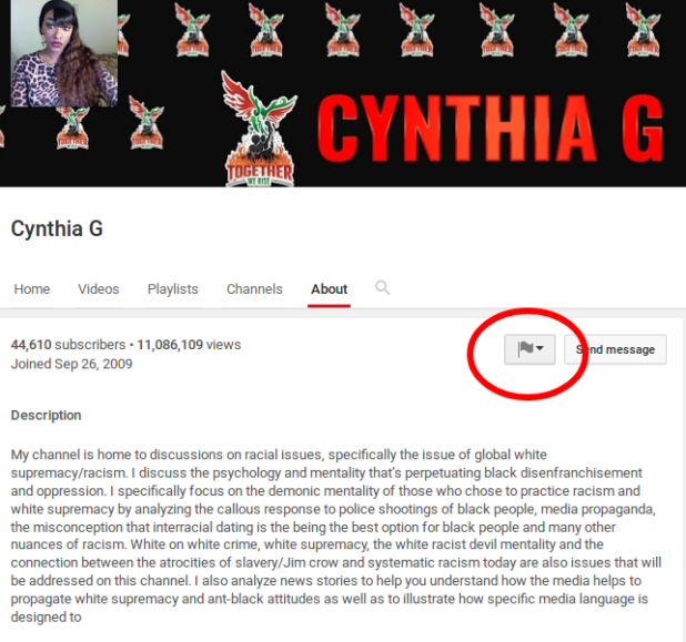 Cynthia G runs a YouTube channel for the sole purpose of insulting, attacking and psychologically harming white people. Each video she produces contains endless hate speech against whites, who she calls "cave beasts," "albinoid devils," "animals" and many other such terms. She also continually claims that white people are "not people." Her entire premise is that whites are "evil" and "inferior." Furthermore, she engages in targeted harassment of white individuals and groups.