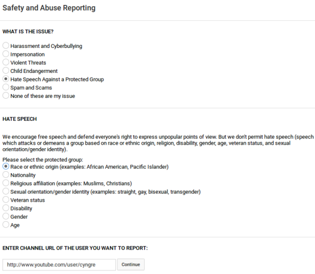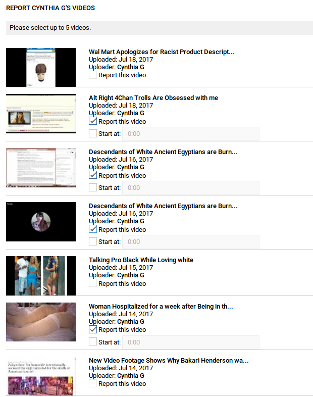 Click “continue,” and you will be given the option of selecting five videos to report. You can just click any of them, as they are all hate videos.