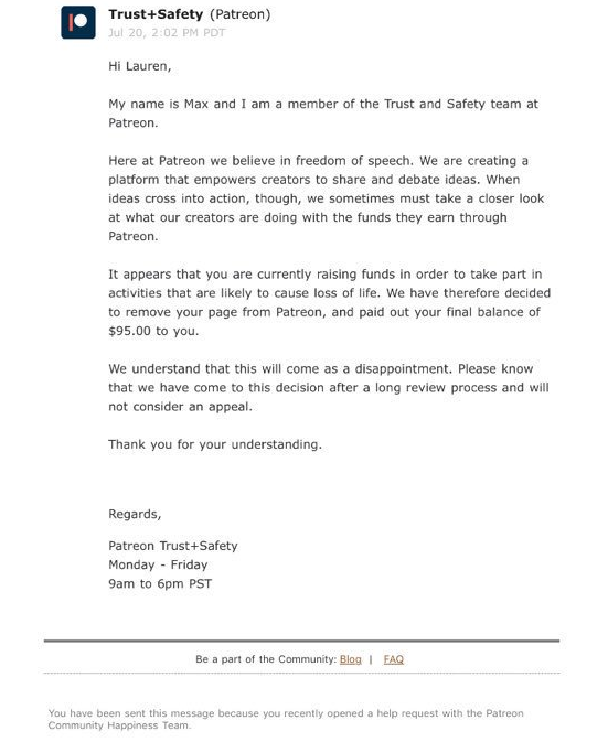 Ostensibly, Patreon banned her because they said she is planning to murder people.