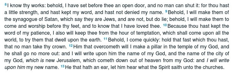 9 Behold, I will make them of the synagogue of Satan, which say they are Jews, and are not, but do lie; behold, I will make them to come and worship before thy feet, and to know that I have loved thee.