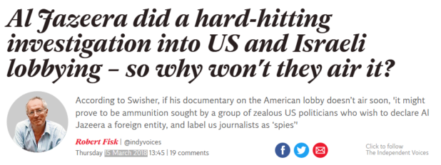 No, I’m talking about a documentary called The Lobby, directed by one of Al Jazeera’s top journalists, Clayton Swisher, the man whose exclusive (and book) on the “Palestine Papers” blew open the secret and scandalous American-led negotiations between Israelis and the Palestinian authority between 2000 and 2010. But after months of postponement, The Lobby, which secretly filmed pro-Israeli US activists and Israeli government officials and was completed last autumn, is still no nearer to being shown – and Swisher himself has taken a paid leave of absence. He even chose to explain his frustration in an article for the progressive American Jewish magazine Forward, which has always maintained a liberal and often very critical view of Israel.