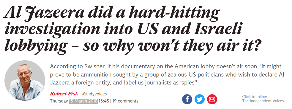 So when am I going to be able to watch Al Jazeera’s hard-hitting investigation into Israel’s powerful lobby in the United States? Remember Al Jazeera? The tough, no-holds-barred Middle East satellite channel that transformed Qatar into a media empire whose reports frightened dictators and infuriated potentates and presidents alike? Why, George W Bush once wanted to bomb its headquarters in Doha – so it must have been doing something right. It even has an office in Jerusalem.