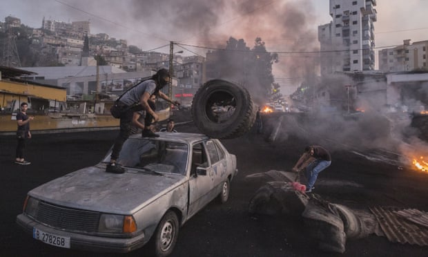 The mood was a mixture of rage, defiance and hope. As night fell, crowds waving Lebanese flags marched through the streets as patriotic music blared from loudspeakers. They shouted: “Our demands are one, our objective is one: the people want the downfall of the regime.”