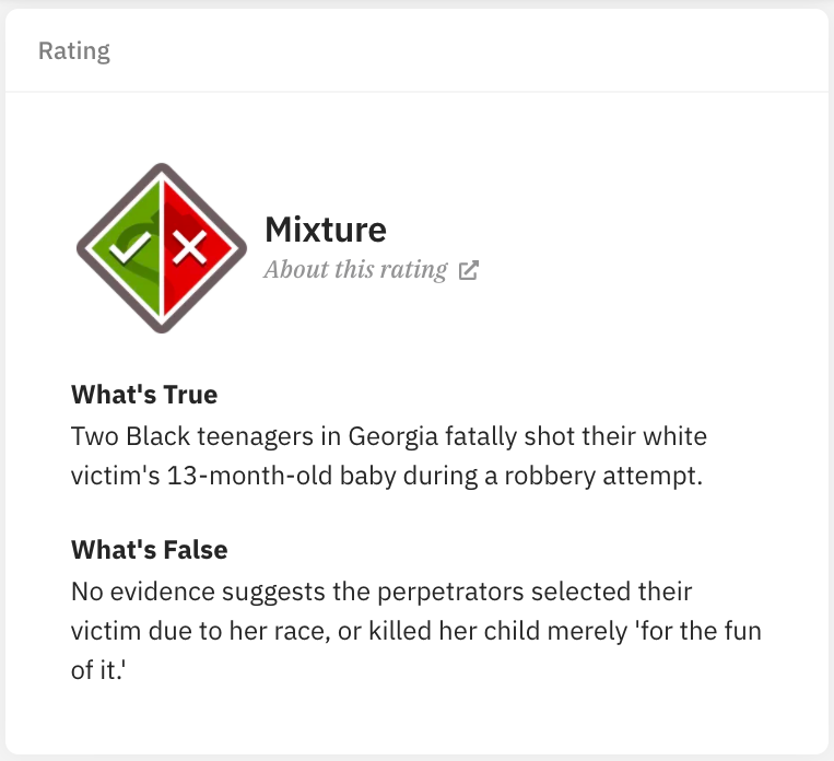 That story is going around again now, and Snopes has a page up about it, explaining to the goyim that the teenagers didn’t kill the baby because he was white, and this was actually “an attempted robbery.”