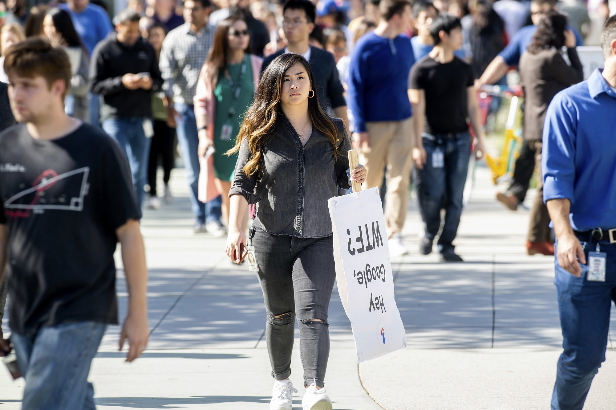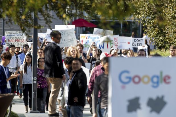 Carrying signs that included a mocking use of the company’s original “Don’t be evil” motto, thousands of Google employees around the world briefly walked off the job Thursday to protest what they said was the tech giant’s mishandling of sexual misconduct allegations against executives.