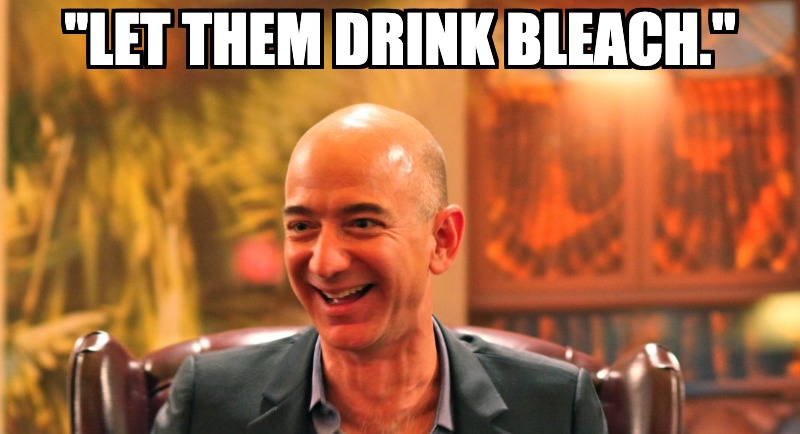At Jeff Bezos’ Amazon.com, he is selling people drinkable bleach as a solution to their paranoid delusions about this flu.