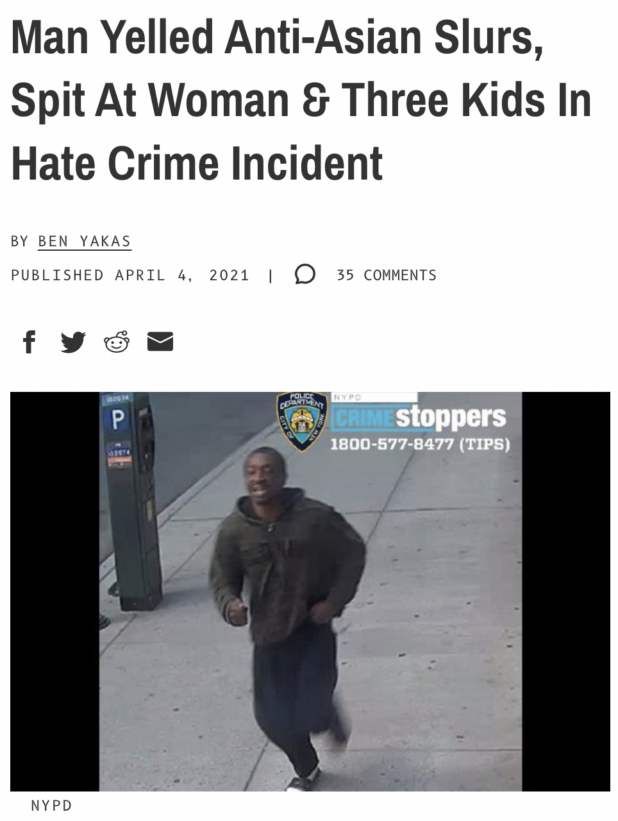 That links to “A 44-year-old woman on the subway was spit at by a man who hurled her phone to the tracks and called her an “Asian slut” in front of her children” in the New York Post, which doesn’t give a description or photo of the suspect. However, Gothamist has a picture from the NYPD, unfortunately.