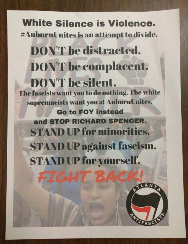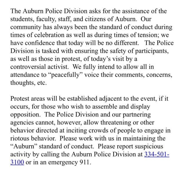 Here is a statement by Auburn police on the official “protest zone.” The “peaceful” liberal front-protest is called “AuburnUnites,” which is being coordinated by the campus (((Hillel))):