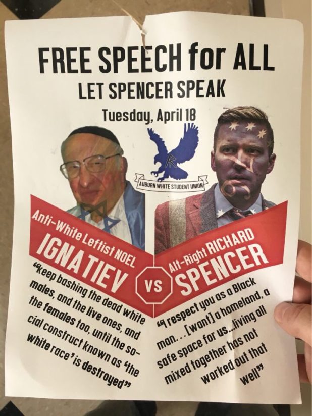 Alabama’s Auburn University, a public institution mandated to protect free speech by law, cancelled a scheduled Richard Spencer speech citing “safety concerns” – this is a weird euphemism for “communists threatening to riot.”