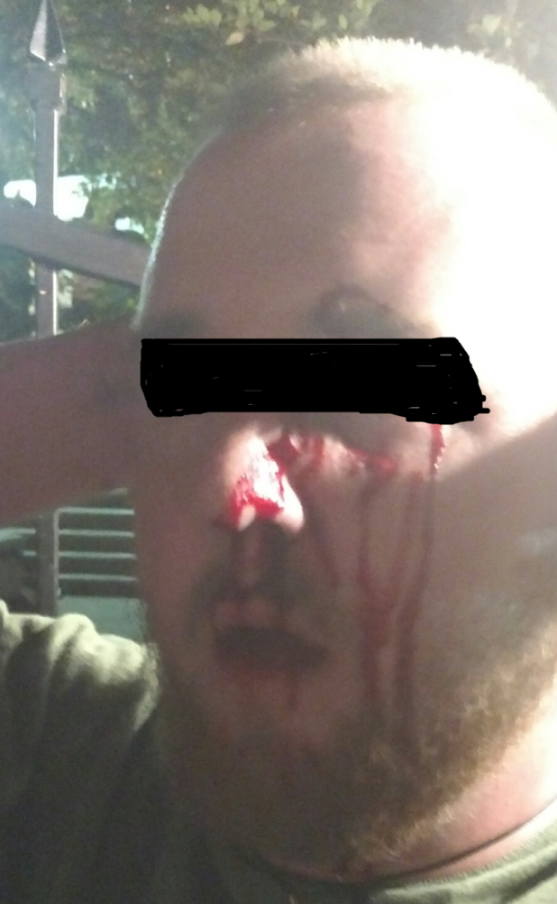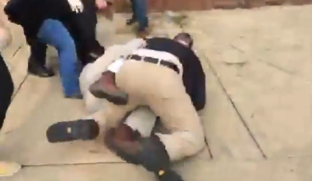 Smaller long haired man filming on the Antifa side of the fence is attacked by group of communist thugs, including a giant fat Antifa. Guy in blue got some damn good licks in though. First Blood.