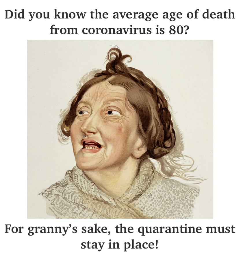 The way people are freaking out about it, it seems that they think they are personally going to get it and die, not that they are worried about grandma (or, in the case of America, morbidly obese black people in their 50s). So I don’t think the media has really done a very good job in communicating who exactly we are doing this to protect.