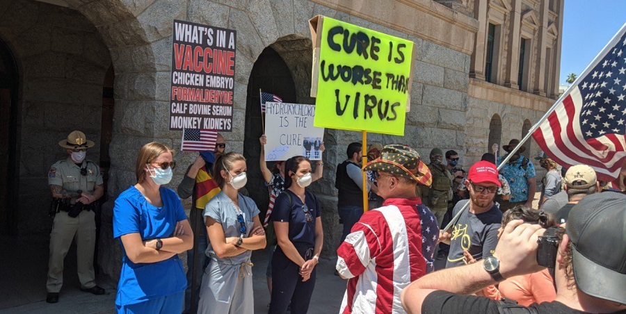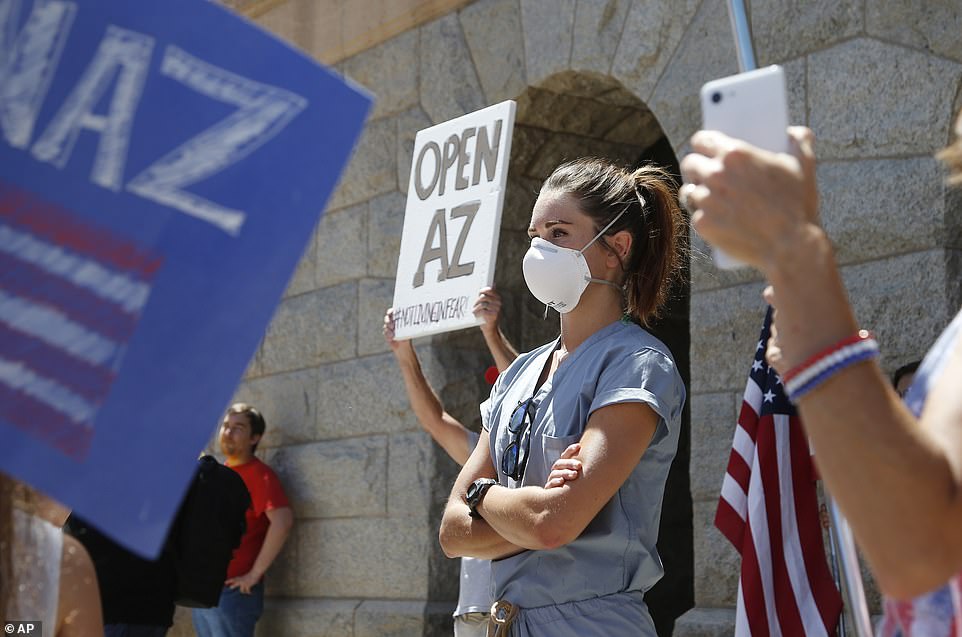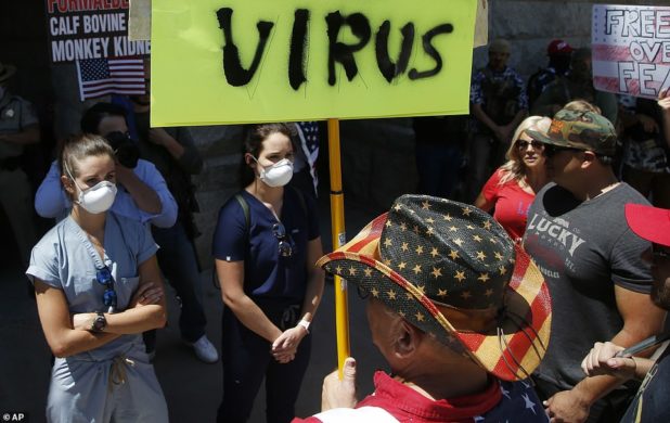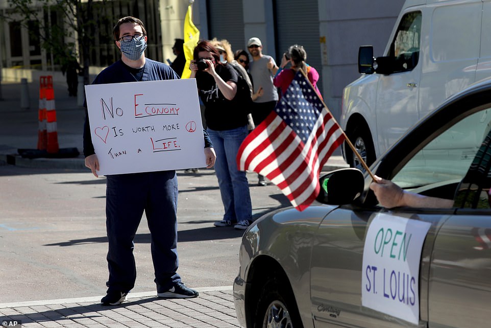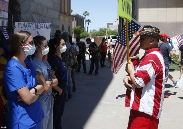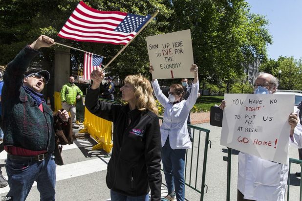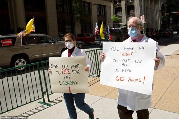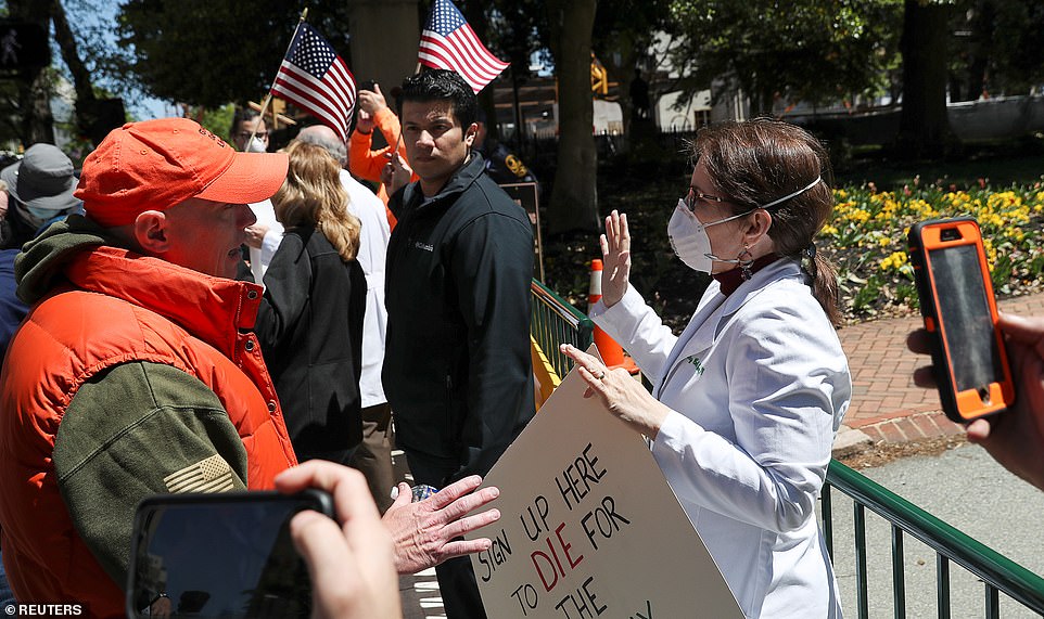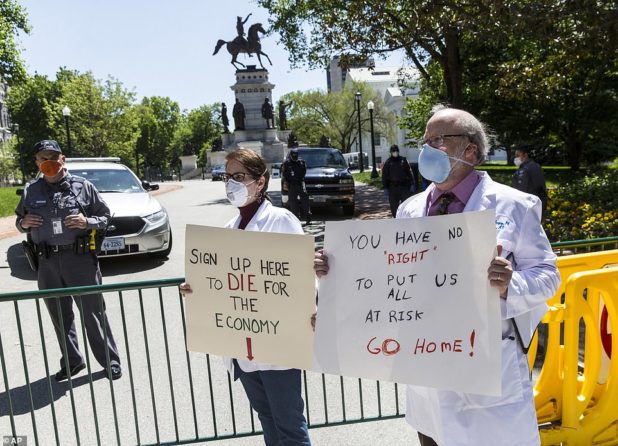 Healthcare workers took to the streets Wednesday to counter-demonstrate against anti-lockdown protesters across the US, reminding the social distancing rebels of the fatal implications their actions could pose to the lives of front-line workers.