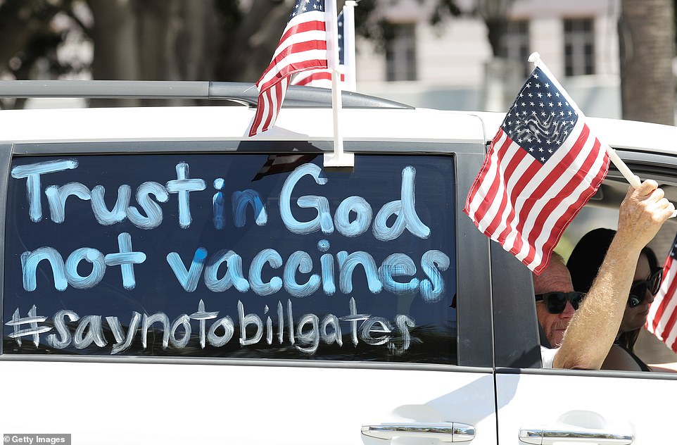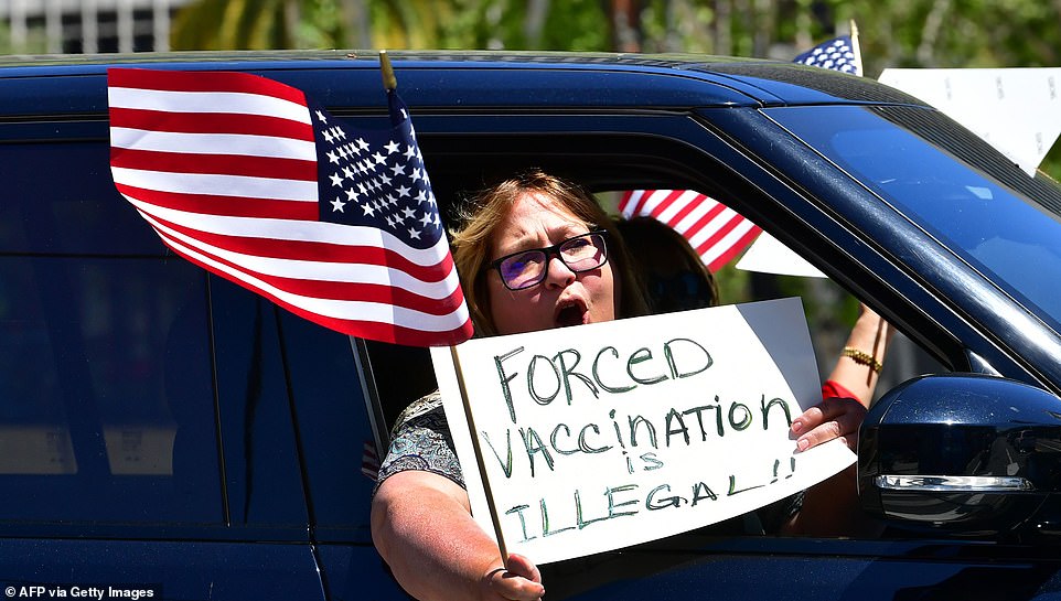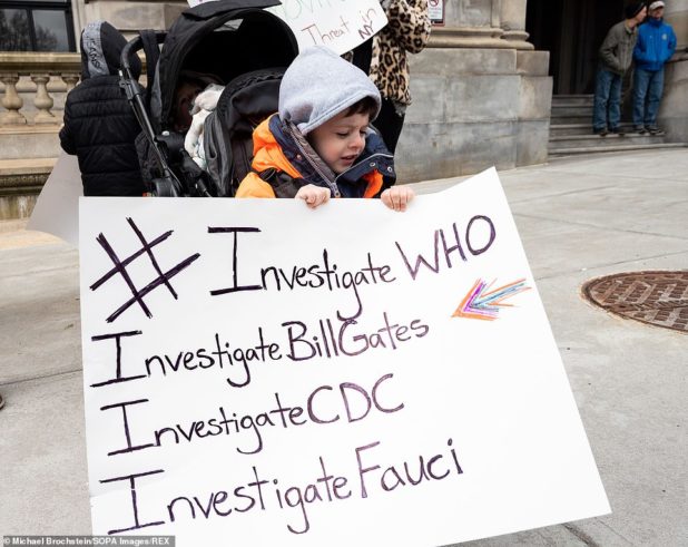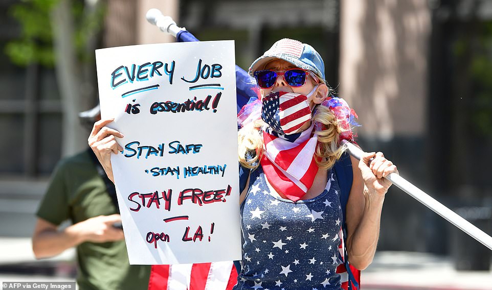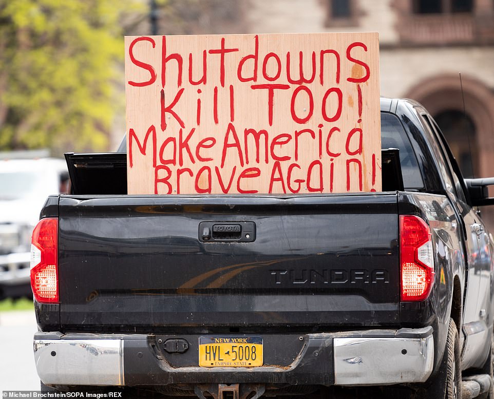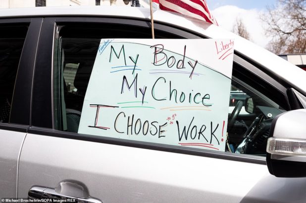 Kristen, meanwhile clutched a sign reading ‘Sign up here to DIE for the economy’, an ironic jibe at the crowd’s willingness to enlist in a protest amid a global pandemic, while healthcare workers are given no such choice.