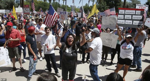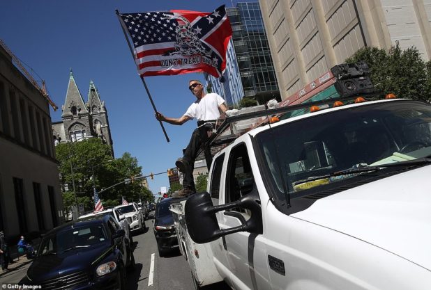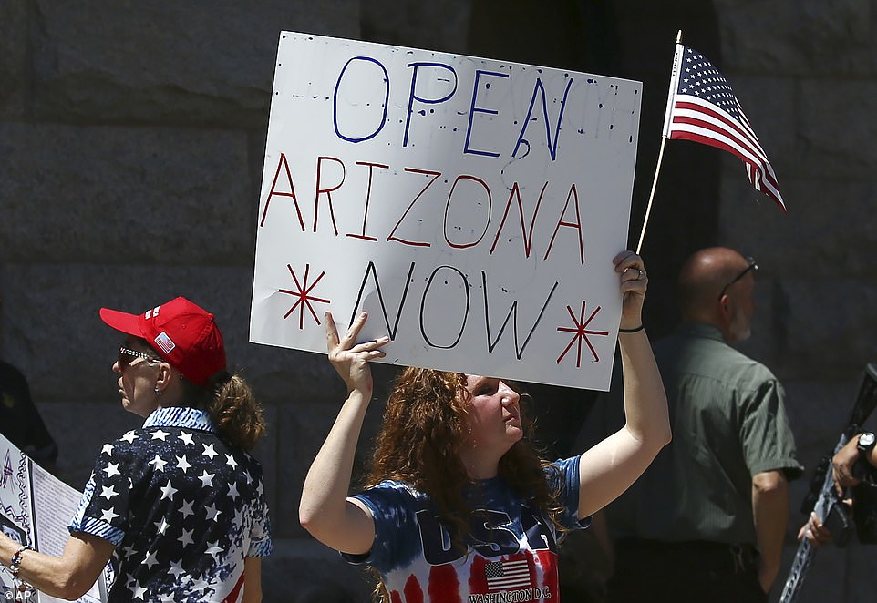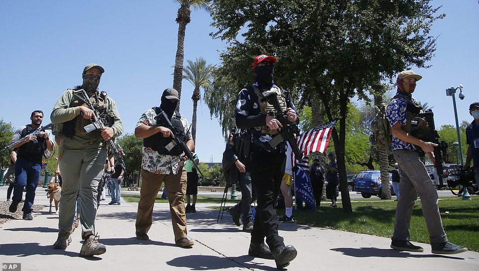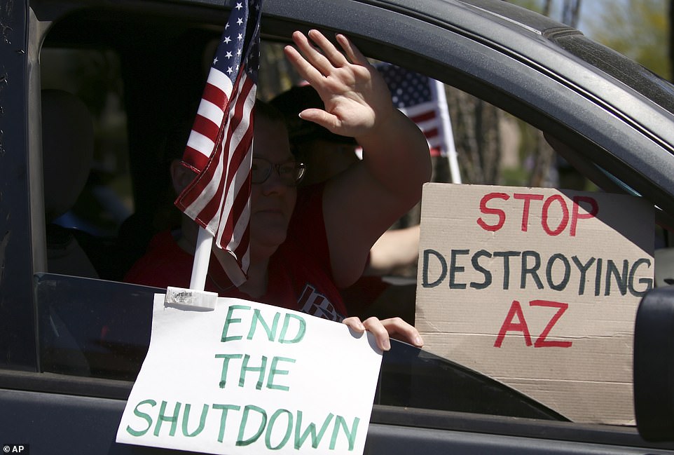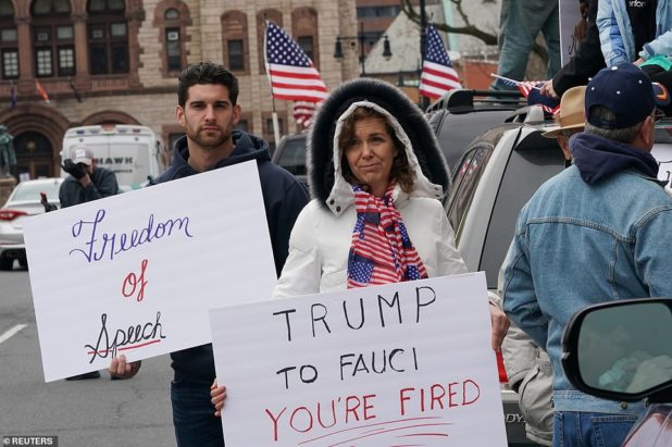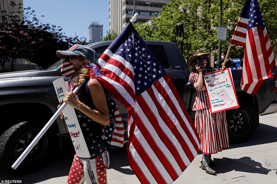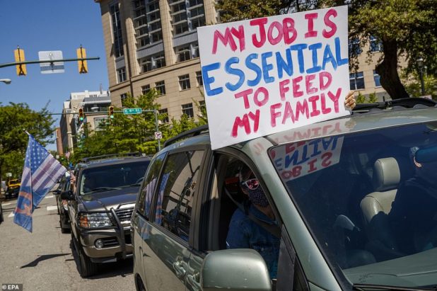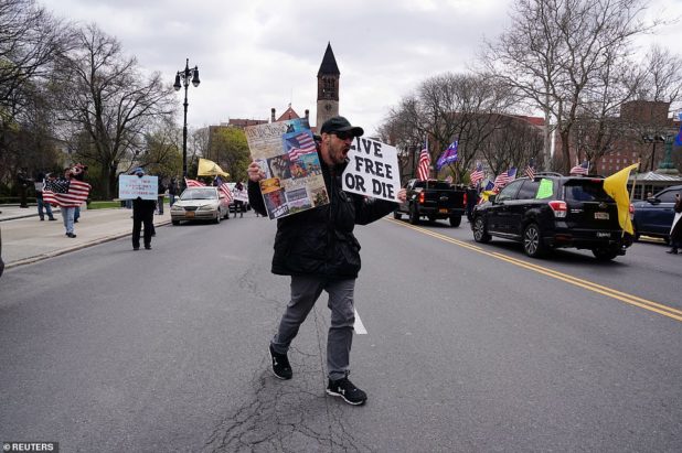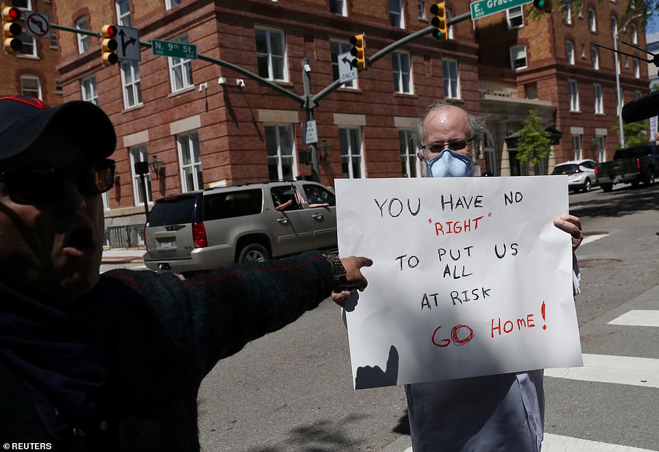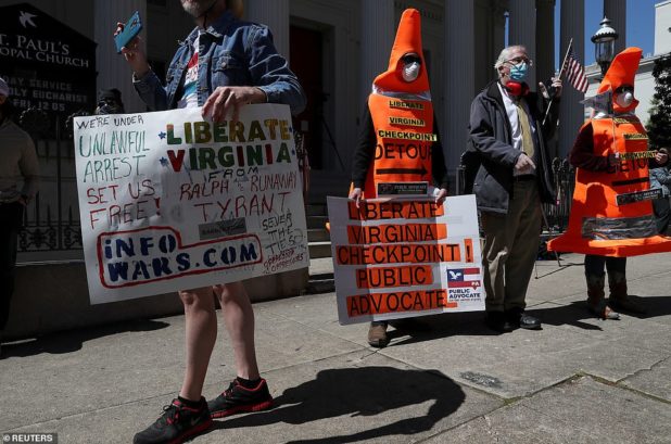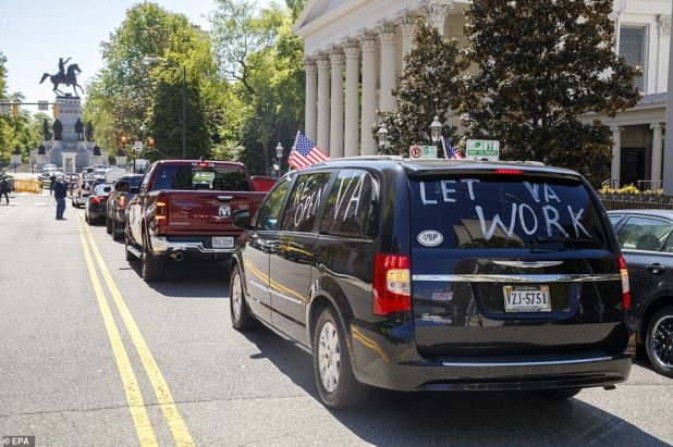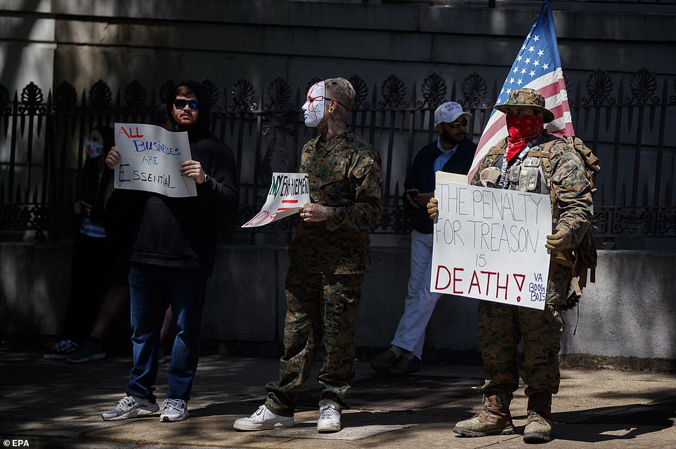 Meanwhile in Richmond, prostesters waved American flags, some dressed in army garb, holding signs saying ‘Liberate Virginia’ and ‘Feeding my Family is Essential’ in the protest organized by conservative group ReOpen Virginia.