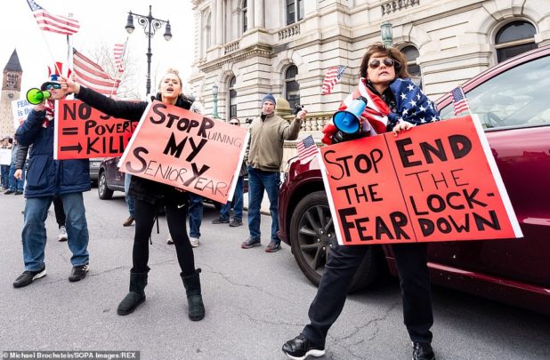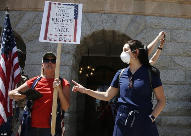 In Vermont demonstrators braved the snow outside the Statehouse in Montpelier to rally for the end of the state lockdown. A group of nurses counter-protested against their demands, wearing their scrubs and facemasks.