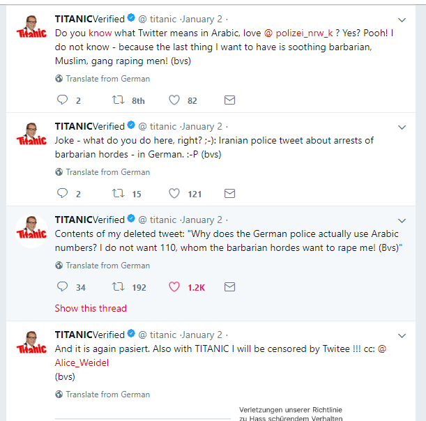 Among others, Titanic parodied a tweet by Beatrix von Storch, deputy parliamentary leader of far-right party, Alternative for Germany (AfD), in which she accused police of appeasing what she called “barbaric, gang-raping Muslim hordes of men.”