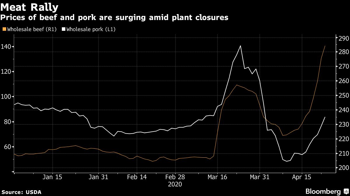 Prices are surging. U.S. wholesale beef touched a record in the week ended April 24, and wholesale pork soared 29%, the biggest weekly gain since 2012.