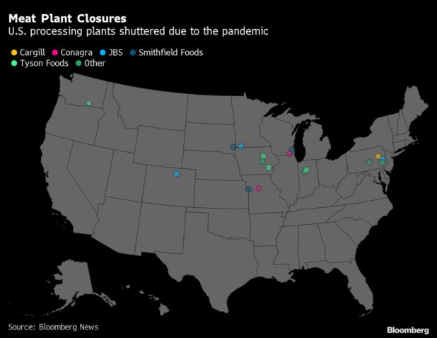 New U.S. shutdowns are hitting at a dizzying rate. Smithfield Foods Inc., the world’s No. 1 pork producer, said Friday it was closing another operation, this one in Illinois. That news hit less than an hour after Hormel Foods Corp. said it was idling two of its Jennie-O turkey plants in Minnesota. JBS said Sunday it will shutter a beef production facility in Wisconsin.