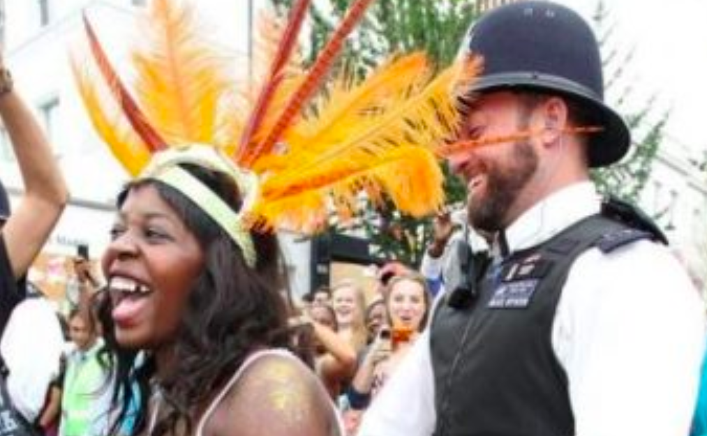 I think that they think showing smiling Africans in fancy feathers and then the serious black-clad police right after is supposed to insinuate that the police are bad and there to kill the fun.