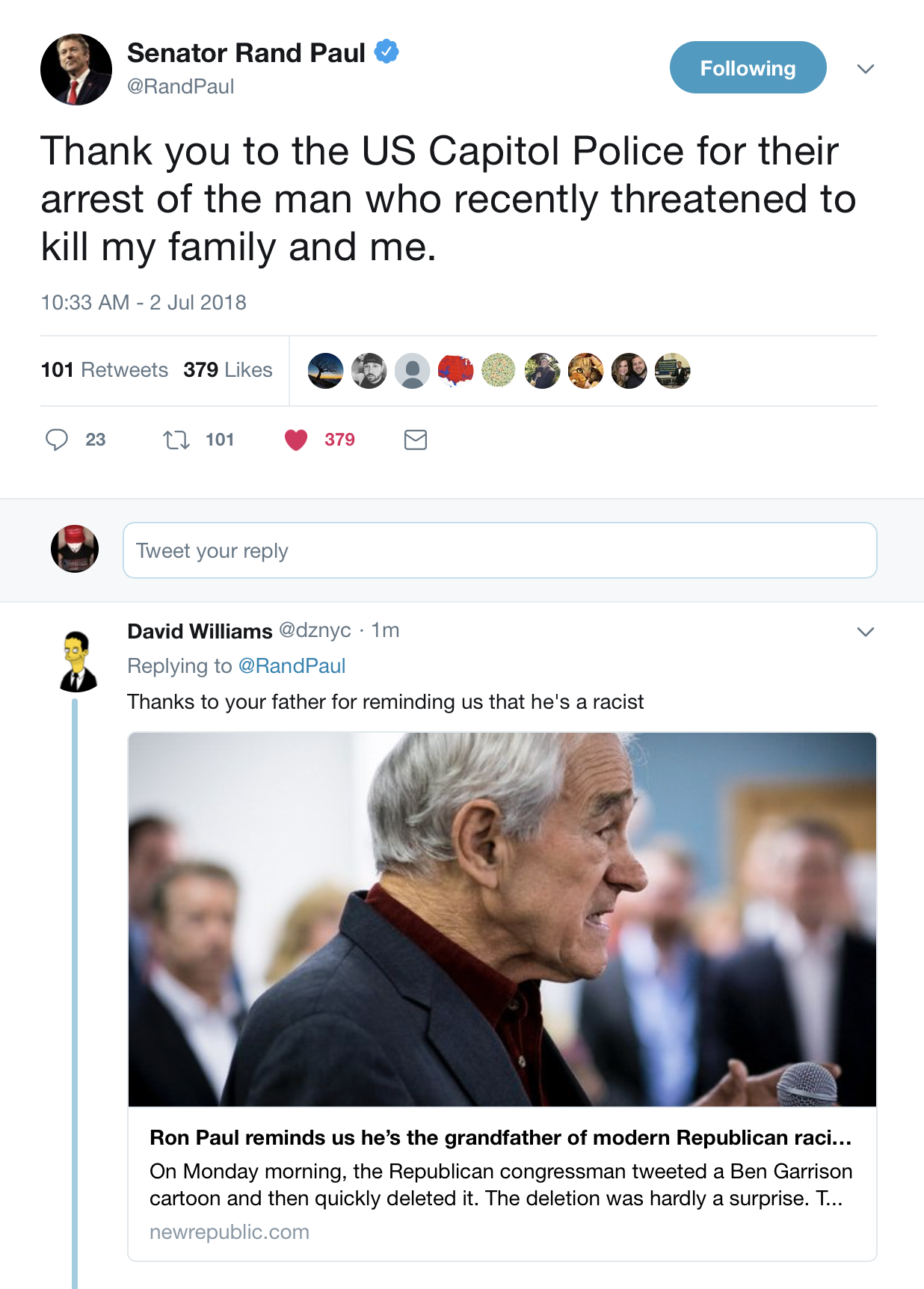 And Twitter faggots have of course started harassing his son Rand Paul immediately.