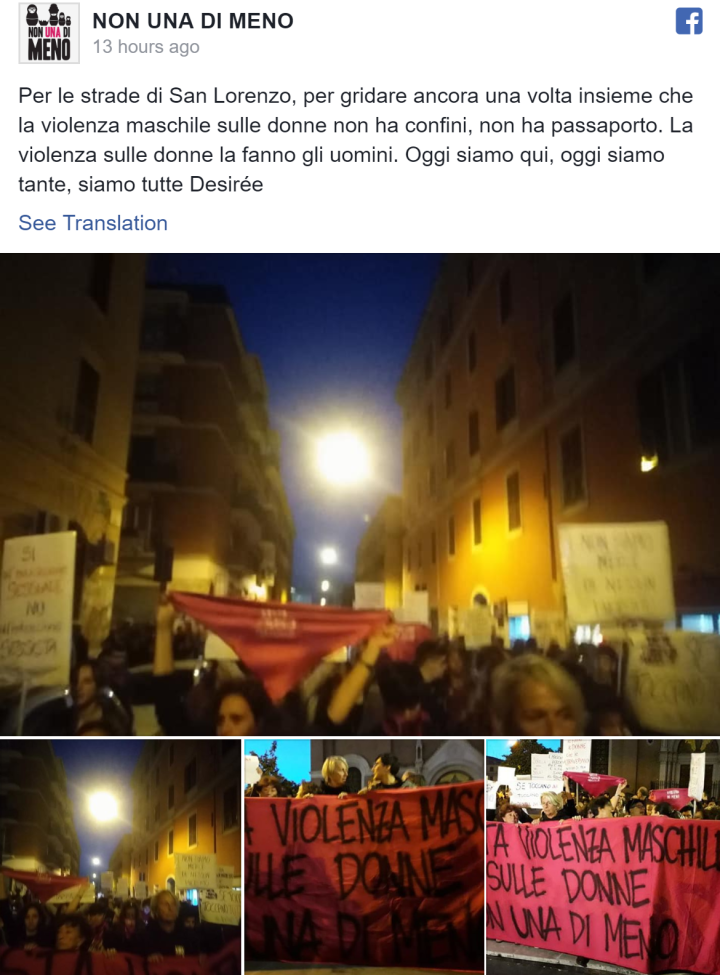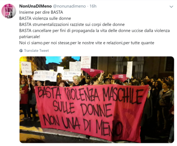 Crazed feminist group NonUnaDiMeno (Not One Less) turn up in San Lorenzo, the scene of the atrocity, to protest not against immigration, but patriarchy and racism.