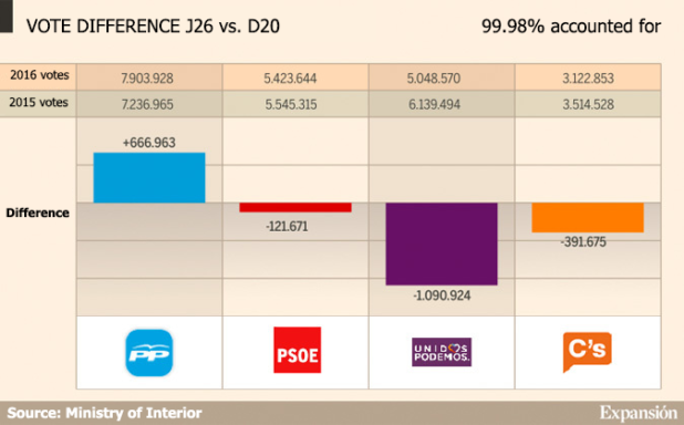 The above image shows Spain’s major political parties vote breakdown in millions.