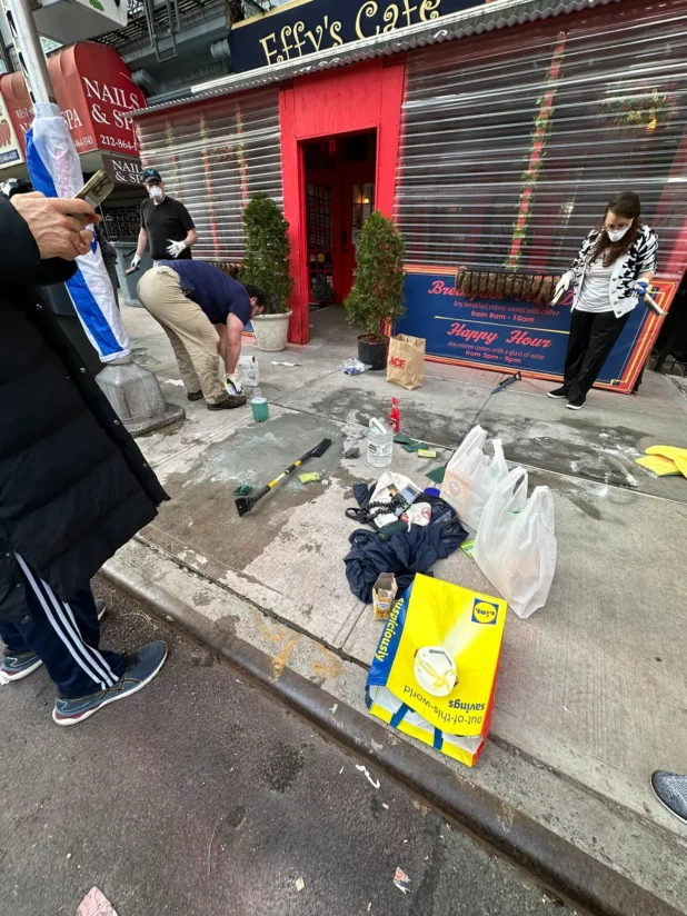 On Saturday, the outside of the popular American-Israeli restaurant Effy’s Cafe at 96th Street and Columbus Avenue was covered in spray-painted messages that read “Free Gaza” and “Form a line here to support genocide.”