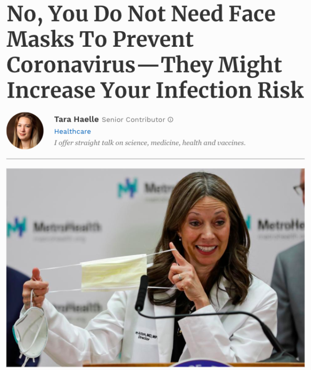 Some fake news outlets, such as Forbes, were going so far as to tell people they would be MORE LIKELY TO GET INFECTED if they wore masks!