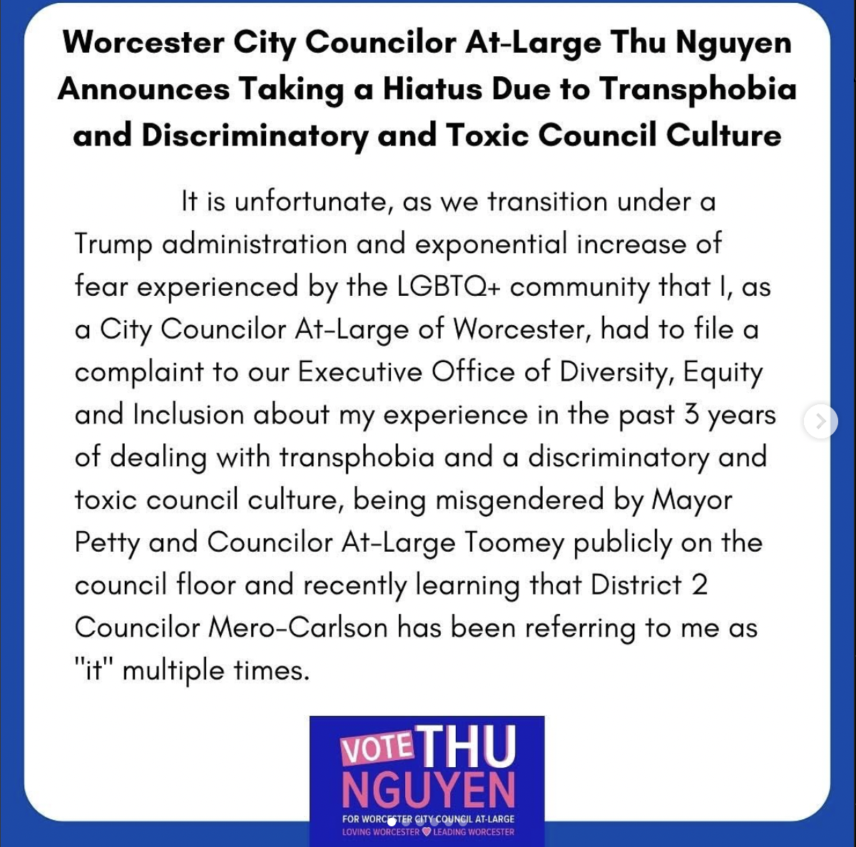 They claimed to have been misgendered by Mayor Joe Petty and Councilor At-Large Kathleen Toomey. Nguyen also alleges they were referred to as ‘it’ on multiple occasions by Councilor Candy Mero-Carlson.