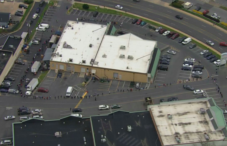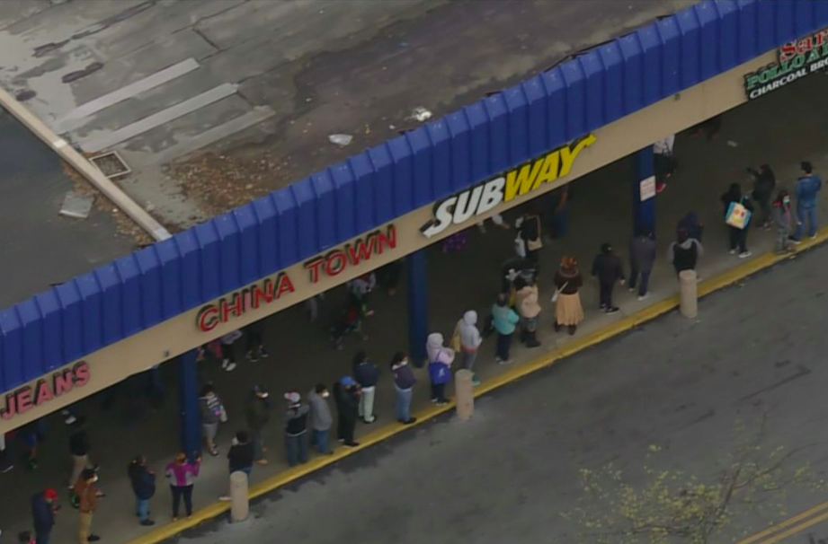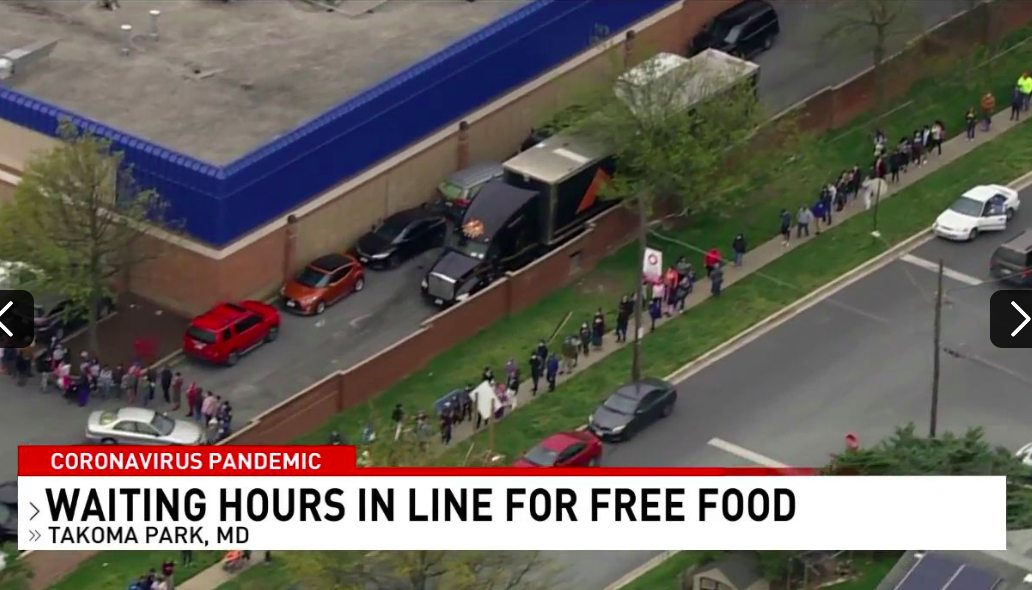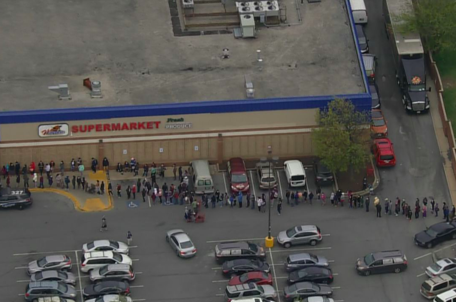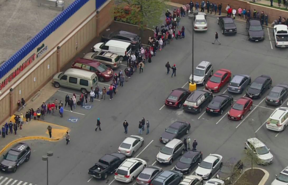Long lines wrapped around Megamarts in Takoma Park, Rockville, and Gaithersburg as customers waited for free food, with little space between them.