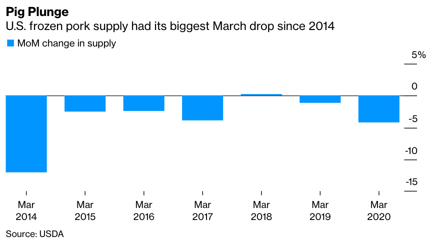 In March, when U.S. shoppers were clearing grocery shelves amid lockdowns, frozen pork in warehouses slumped 4.2% from February, the biggest drop for any March since 2014. That happened before the meat plants started closing.