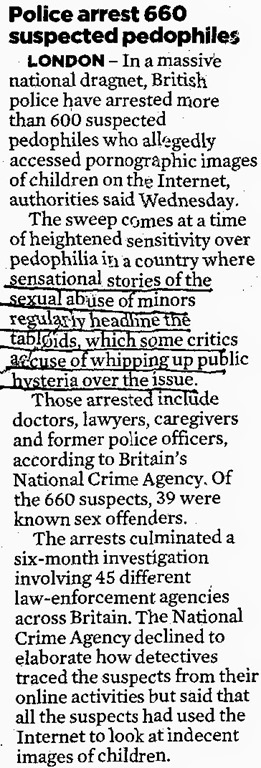 Examine the clipping above. It was published in this morning’s (July 17, 2014) Spokesman-Review newspaper (Spokane, Washington), p. A3. The article concerns the arrest of child pornography supporters (“pedophiles”) including “doctors, lawyers” and ex-police officers.