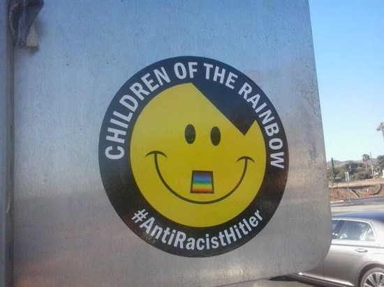 The other sticker read “Children of the rainbow“, and contained the hashtag “#AntiRacistHitler“. It also had a cartoon Hitler face with a rainbow mustache.