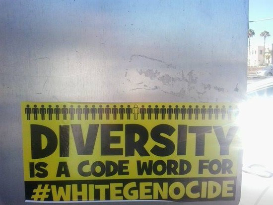 One sticker contained the phrase “Diversity is a code word for #WhiteGenocide” which has also recently been featured on a billboard in Arkansas.