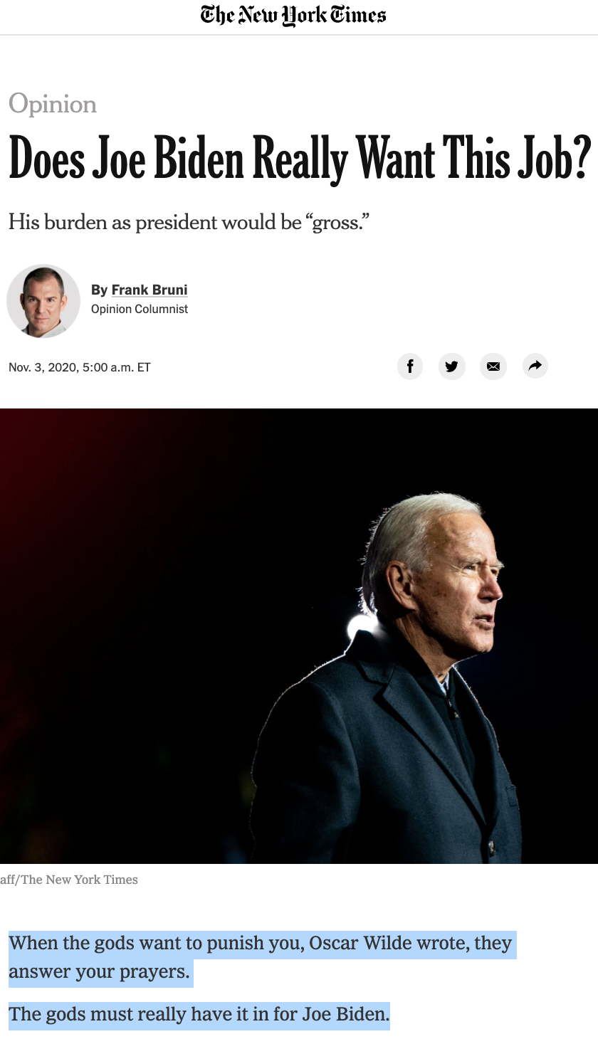 NYT’s Frank Bruni is the true anal Satan, calling upon pagan gods to help Joe Biden.