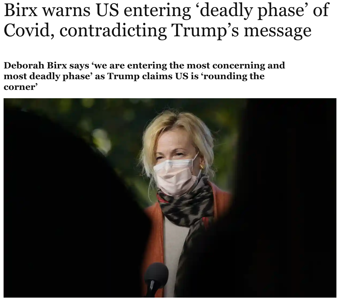 Birx gave the warning in a written memo delivered to top administration officials Monday. It is a direct contradiction of one of Donald Trump’s central, and false, closing campaign messages – that the US is “rounding the corner” on the pandemic.