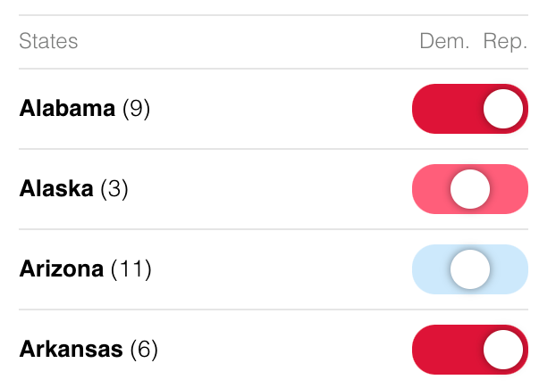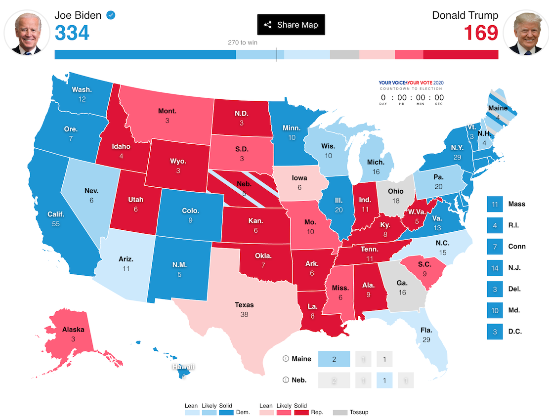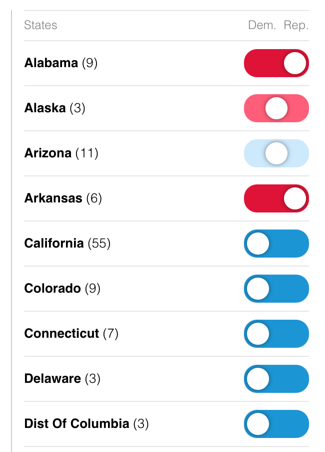 You can click the side and show the states as red or blue, and get the resulting electoral votes.