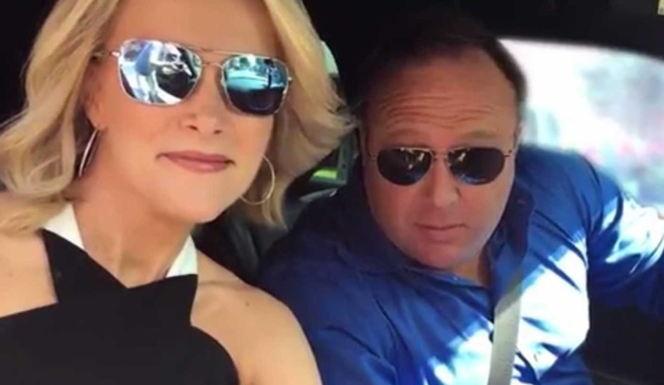 Megyn Kelly shown with Alex Jones after shooting pornographic videos in the Infowars studio.