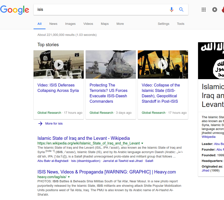 The second result for “ISIS” returns a page marked “WARNING: GRAPHIC,” containing videos of torture, beheadings and other ISIS atrocities.