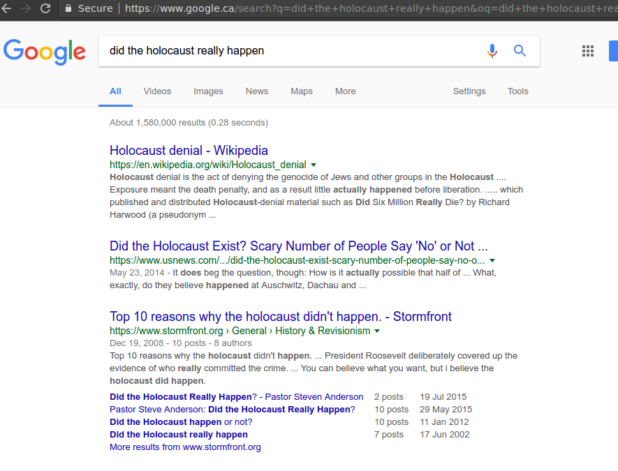 One story in particular highlighted how a search for “did the Holocaust happen” returned, as its top result, a link to the white supremacist forum Stormfront, explaining how to promote Holocaust denial to others.