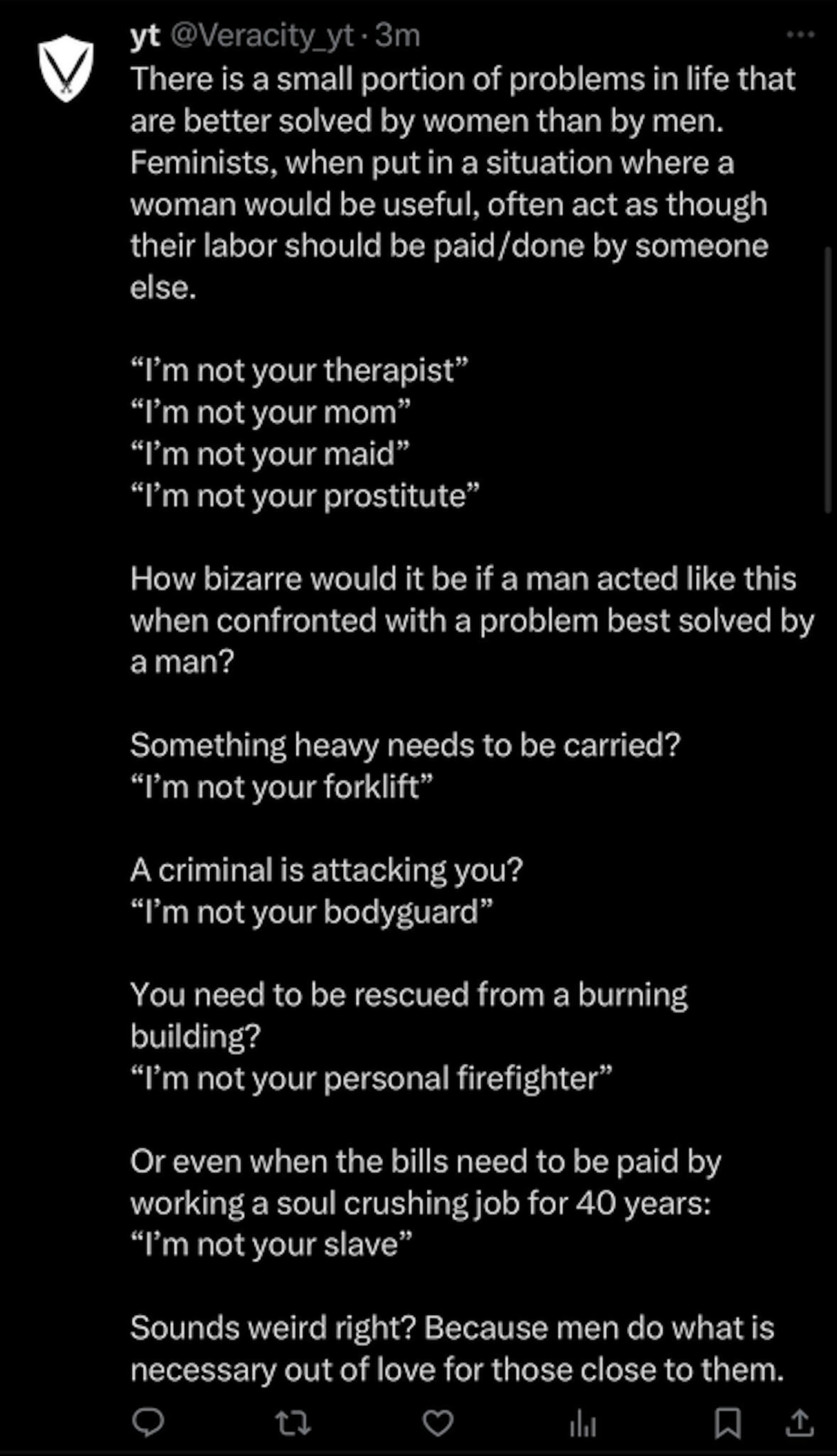 – The left-right divide is fundamentally rooted in masculine and feminine instincts, with the left embodying toxic femininity and the right representing masculine order.