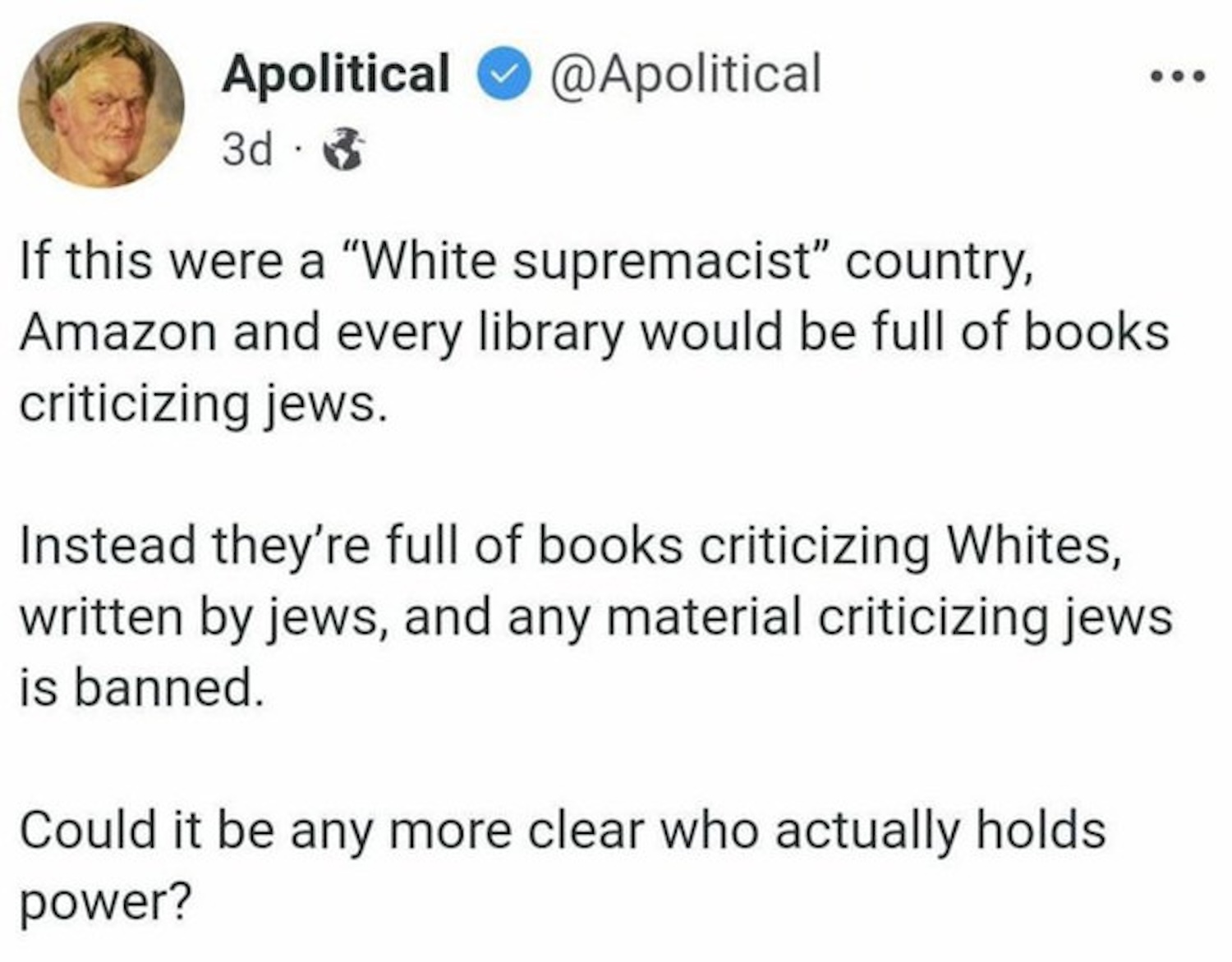 This new year is off to a wondrous start. The world feels full of wonder. I think this will be the pivot year. “Jews can just slaughter thousands of children in Palestine forever because of something that allegedly happened in Germany nearly a century ago” is Peak Jew. This is the point at which people start saying “okay, well, this Jew thing has definitely gotten out of hand.” I’m not joking when I say: I’m virtually certain that within ten years, my rights will be restored, and I will be vindicated globally as “the guy who called it.”