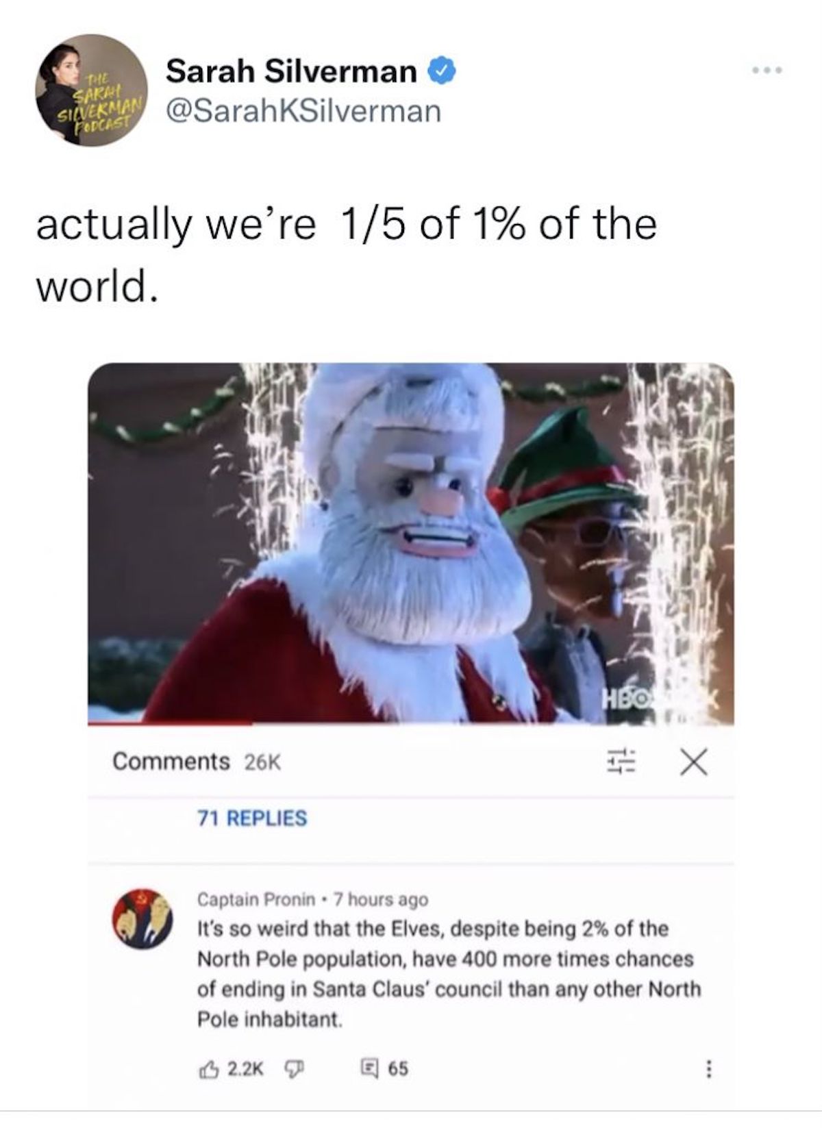 Frankly, I don’t know why, with all of these Christmas tree burnings, I just now thought “these attacks are obviously inspired by the Seth Rogan and Sara Silverman HBO special Santa Inc.” But I should have said that last week and it is obviously true.