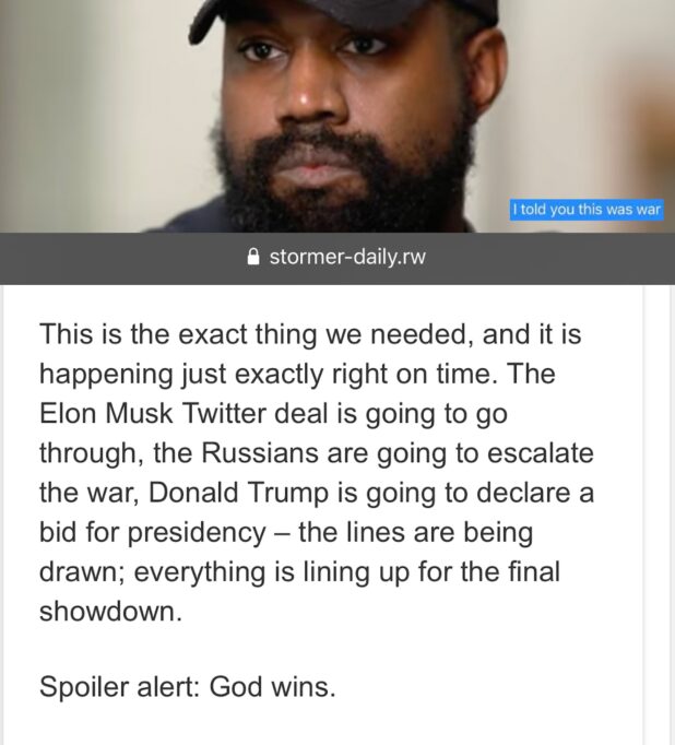These blacks got called out as pussy, now all the blacks are going to dump the Jews and join the war. Kanye is going to lead white supremacists in a reverse Helter Skelter. It’s all happening, it’s all good, it’s fine.