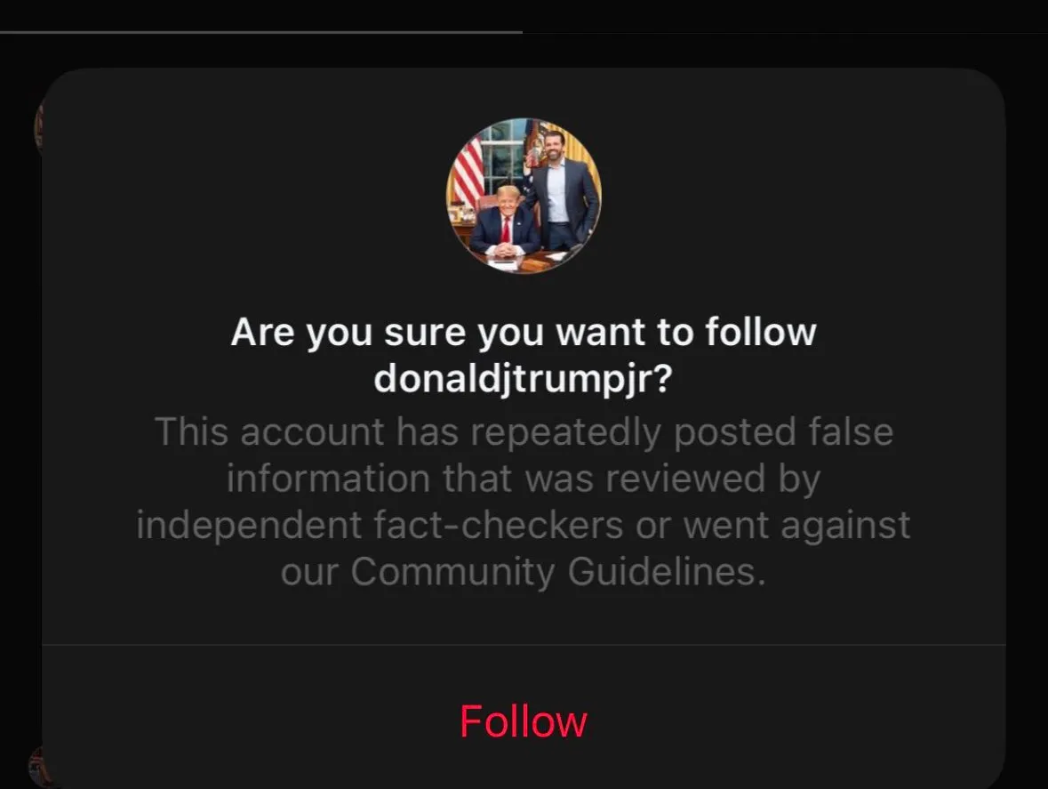 Conservative personalities, including the son of former U.S. President Donald Trump, complained of censorship after labels appeared warning would-be followers that they had posted false information. Another Meta spokesperson said those labels were an error.