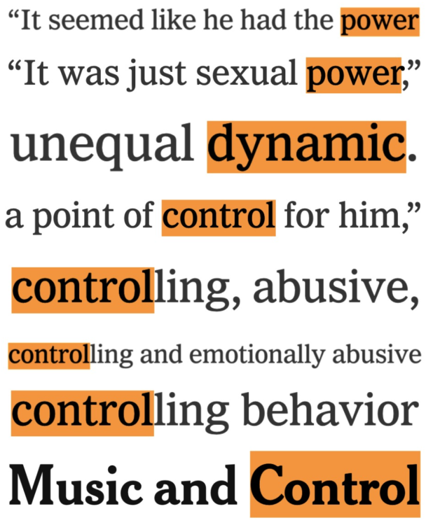 Without that offensive introductory material, the rest of the story would have been rightly seen as completely insane by everyone. What the Times does is just go through his entire relationship history and have a bunch of women say that he was a bad boyfriend. It is lined with suggestions of “power dynamics,” but none of that actually would make any sense to any normal person. These were women that sought him out in order to get a professional advantage, then he flirted with them and they willingly became his girlfriends and had long-term relationships with him.