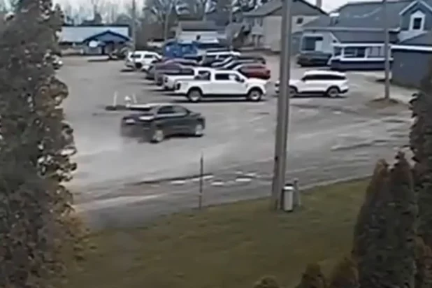 A plume of debris can be seen exploding out of the corner of the frame, cutting off the catastrophic damage the allegedly drunken woman caused.