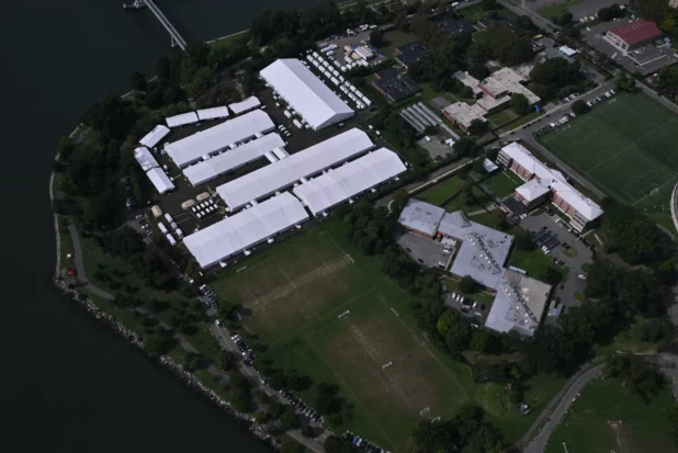 A migrant viciously attacked and bit a security guard who intervened in a fight between the man and his wife inside the Randall’s Island shelter on Monday, sources said.